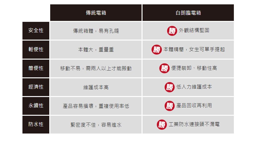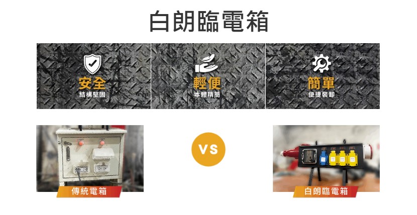 工地戰力大提升,施工現場臨時用電配電箱,白朗臨電箱結構堅固安全、本體精簡輕便且簡單和便捷裝卸,一次解決傳統電箱諸多問題,是工地最佳選擇
